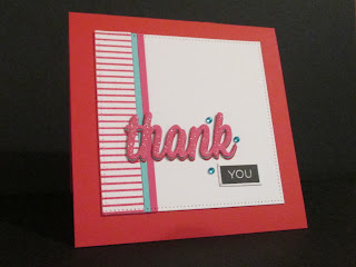 The Paper Players has a fun color challenge this week. Our inspiration is to use the bold colors of Tempting Turquoise, Melon Mambo, Real Red plus Whisper White. For my card I chose a red card base, white panel trimmed in red and white stripes plus thin strips of turquoise and bright pink. The 'thank' sentiment top layer is bright pink with layers of turquoise and red slightly offset beneath. For some sparkle clear Wink of Stella was painted on the pink layer. For added interest I stamped the YOU in black. A few turquoise rhinestones finish my colorful card.